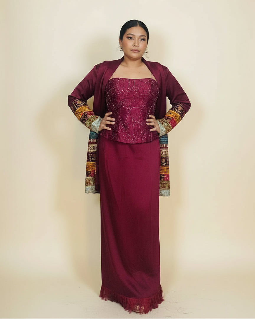 This elegant and modern 3-piece fusion outfit is a beautiful blend of traditional and contemporary style. The set includes a sequins-embellished corset top, a flowy long skirt, and a statement shrug or jacket featuring multicolor ethnic embroidery on the sleeves. The deep burgundy color gives the outfit a royal and classy look, making it a perfect choice for festive occasions, parties, and formal gatherings. With its stylish fit and premium fabric, this outfit offers both comfort and glamour.