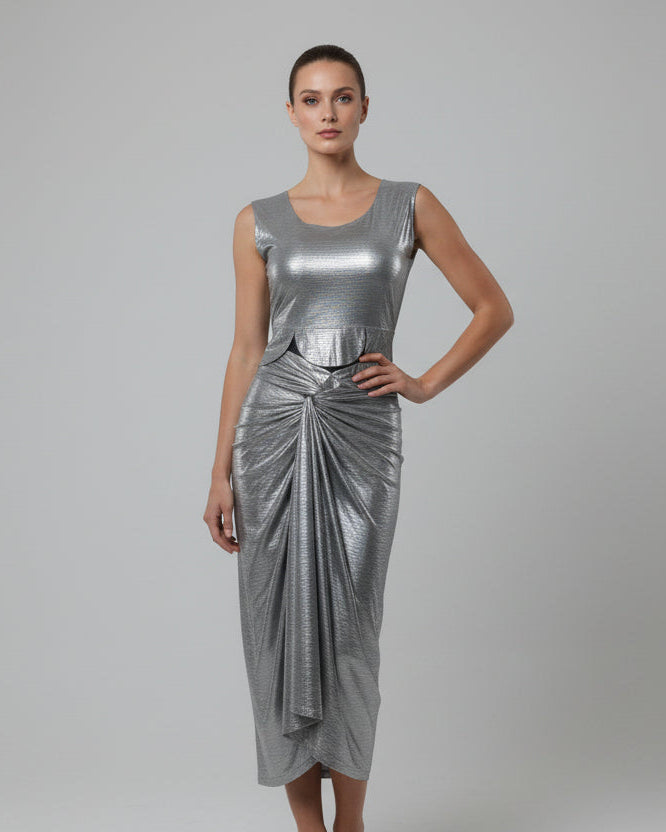 Metallic Silver Draped Midi Dress with Matching Blazer